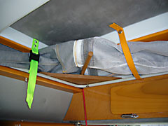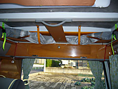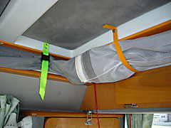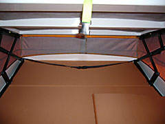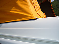 | 2階部分内部前方にはテント地両サイドを渡すコードがある。もちろん就寝時邪魔にならないようにコード中央で切り離せるのだがポップを仕舞うときにはこのコードを軽く引きながらテント地を内側に引き込みつつポップを下げる。それでも若干のはみ出しが出てしまうのでポップを「下げ位置」で固定する前に車外を一回りしてはみ出した生地を手で押し込んでやる。 |