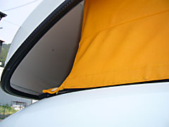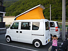 | ポップを上げるとまぎれもなくKキャンカー。布地が厚手で曲面裁断してあるのでシワが少なく美しい。またダンパー類もテント内側に装着されているのでポップはホントすっきりしている。ダンパー類が風雨に直接さらされることがないのは耐久面からもよいのではないだろうか。 | ![]() |